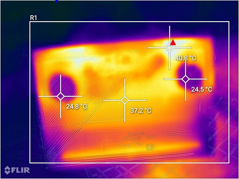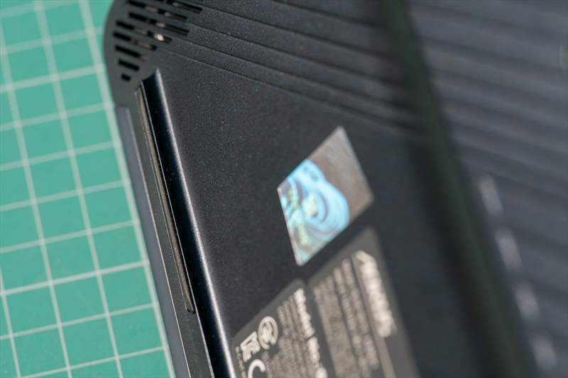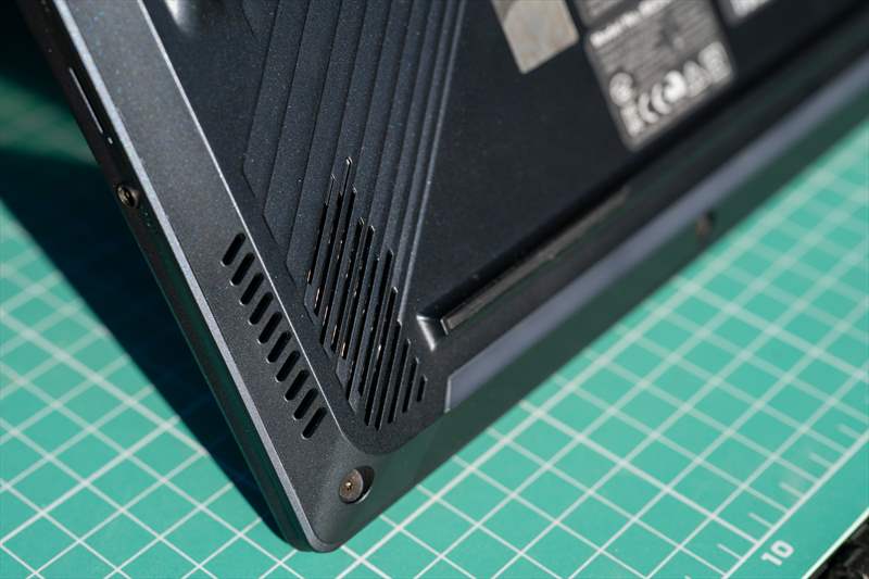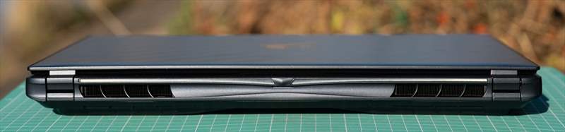 Cam așa se prezintă si partea inferioara a laptopului. Un design complex al capacului inferior si observam 2 difuzoare in partea din fata si 3 orificii care trag aer către interior.
