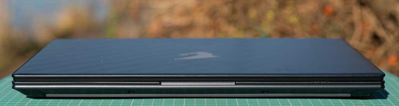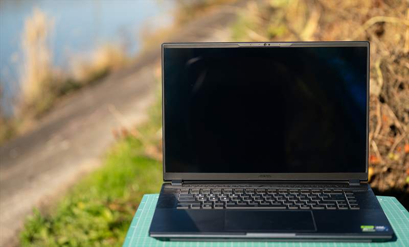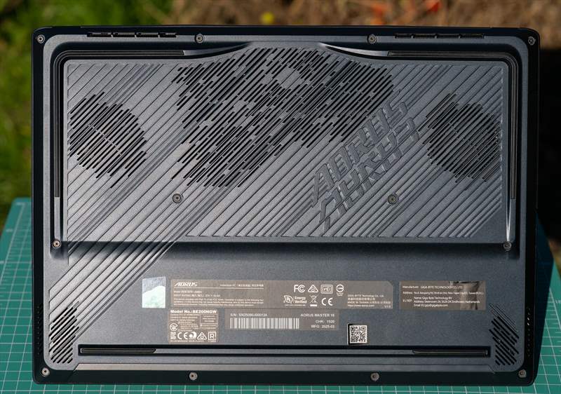 Cam așa se prezintă profilul laptopului Aorus Master 16 din fata si lateral. Un laptop decent pentru cele 2.5 kilograme, dar era loc de un cititor full-size SD UHS-II.