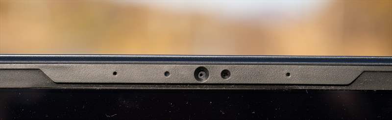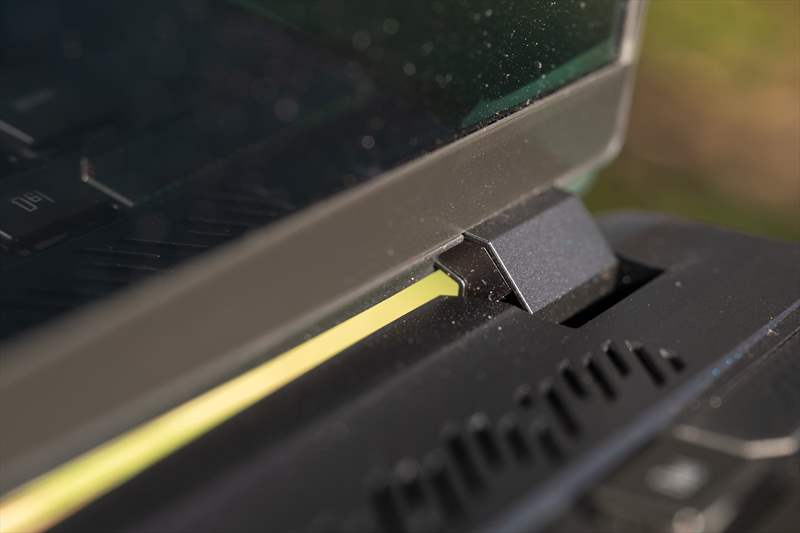 Câteva detalii de la interiorul laptopului includ camera web cu microfon, balamalele subțiri si butonul de power.