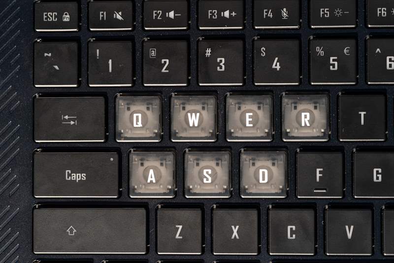 Cam așa se prezintă tastatura, profil slim cu taste care oferă feedback decent + iluminare RGB. Modelul vine fără numpad, dar cu fiecare tasta full-size si spațiată corespunzător.