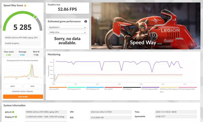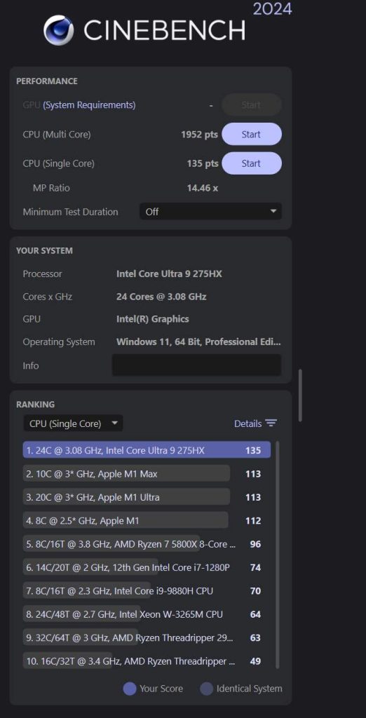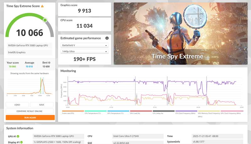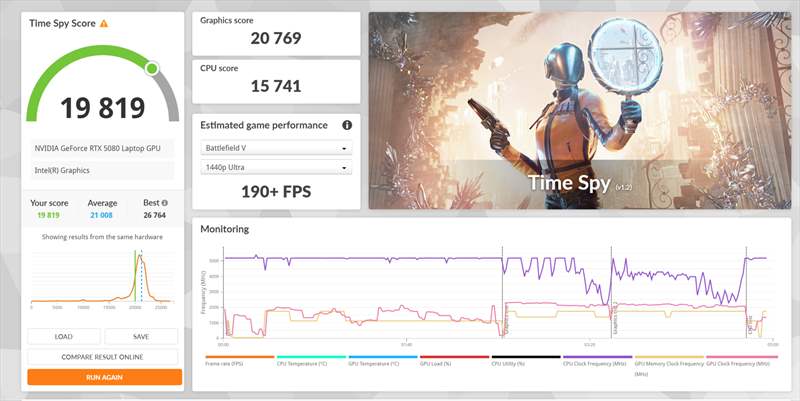 - Performanta CPU + GPU este data de un Intel Ultra 9 275HX si un RTX 5080, iar impreuna pot oferi performante solide in toate scenariile in care am incadrat laptopul mai sus. Iata si cateva cifre: