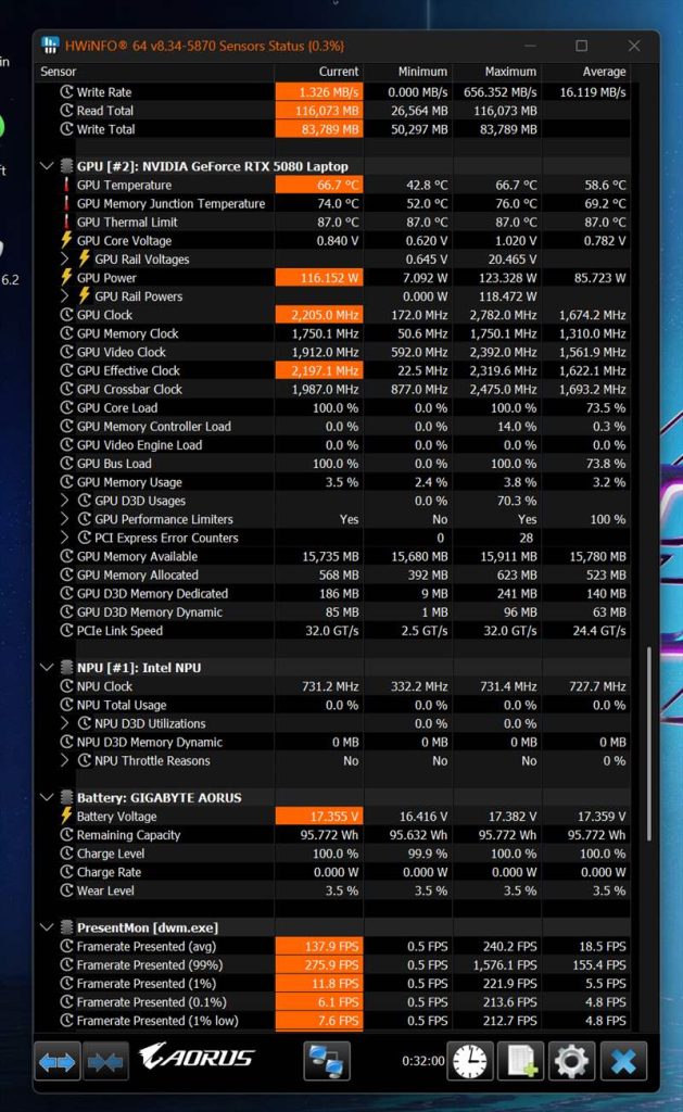 - Upgradabilitatea lui Aorus Master 16 este limitata la 2 x SODIMM DDR5 cu pana la 128 GB de memorie + 2 x SSD PCIe 4.0 + PCIe 5.0 pentru stocare. Maximul de stocare solida poate ajunge pe la 16 TB, iar ce nu am vazut la prima inspectie vizuala a fost cardul de WiFi si Bluetooth. In rest, la acest laptop poti schimba numai pasta termica si bateria. Upgradabilitatea este standard, dar mult mai buna fata de ce oferă Apple.