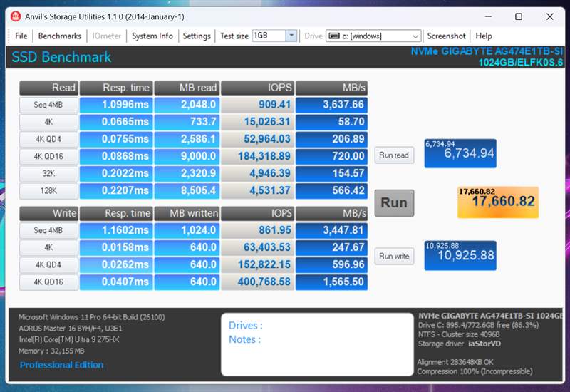 Aorus Master vine cu un SSD intern PCIe 4.0 si performantele sale sunt bune si la interior este un SSD Gigabyte, desigur.
