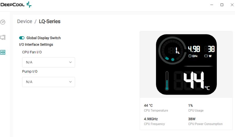 DeepCool Control Software este usor de pus in functiune, trebuie sa conectezi headerul USB al racirii la placa de baza. Instalezi aplicatia de ~419 MB si este gata de configurat ecranul. Interfata este simpla si totusi ocupa mult spatiu pentru functionalitatea limitata pe care o are. Iata cum se prezinta: