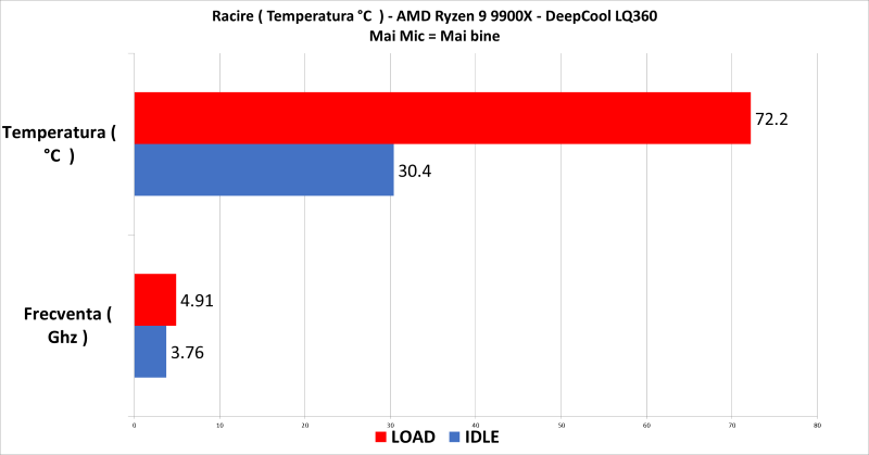 DeepCool LQ360 promite performanta solida pe aproape orice tip de procesor. Desigur, cu conditia ca el sa fie instalat corect si intr-o carcasa cu mesh care poate sa respire/primeasca aer curat din exterior. Am testat DeepCool LQ360 alaturi de un AMD Ryzen 9 9900X si iata ce temperaturi s-au scos: