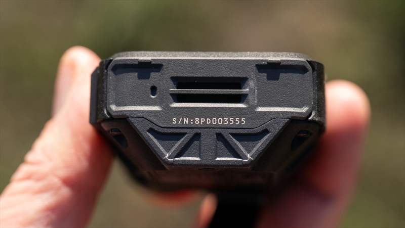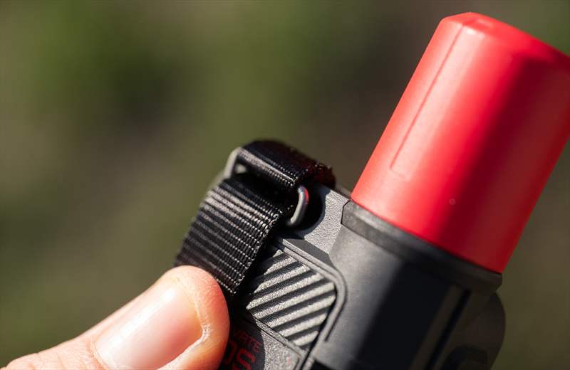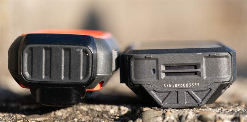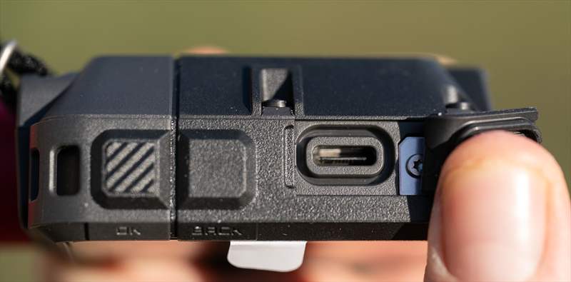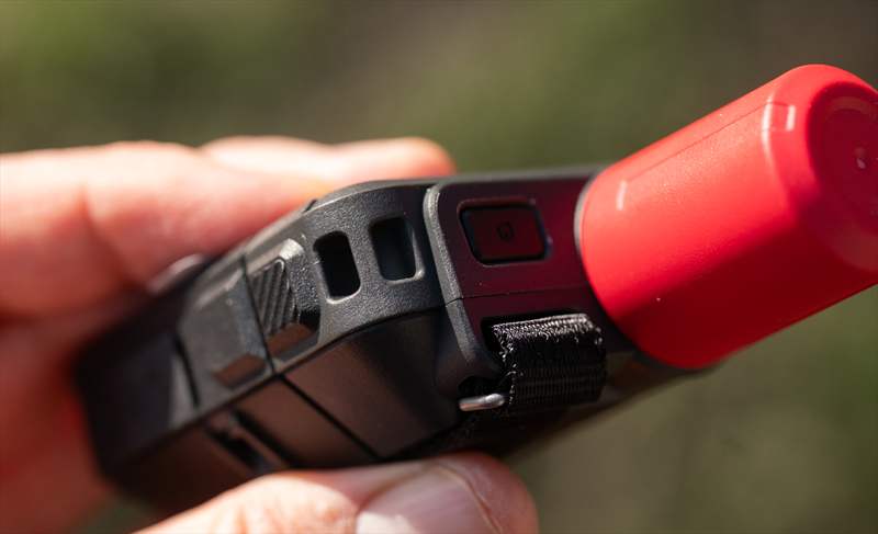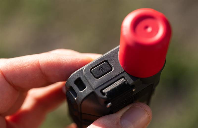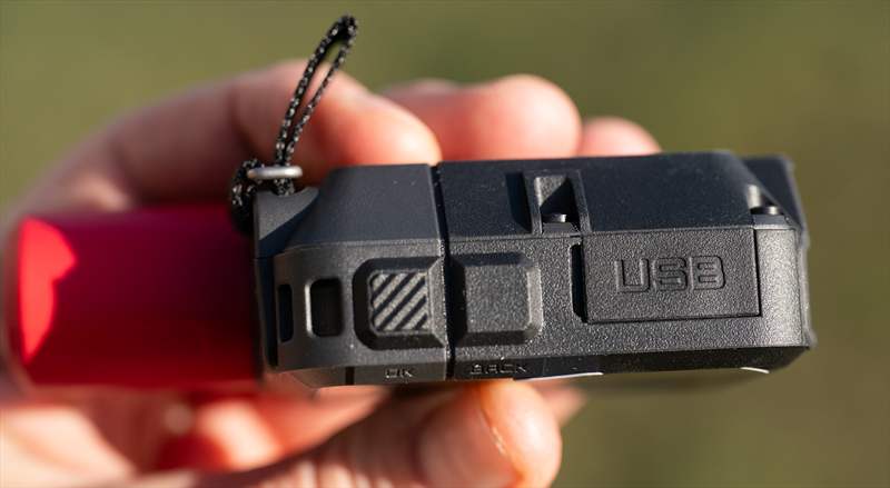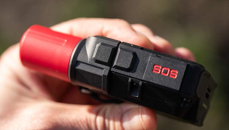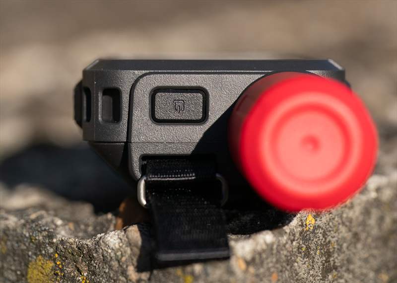 Pe spate putem vedea design-ul nou, sus avem buton de on/off, o prindere de lanyard si o bucata textilă de atașare a carabinierei.