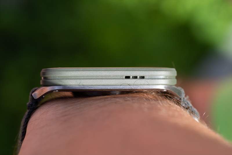 Cam așa arată profilul ceasului la încheietura. Este intr-adevar foarte subțire si vine cu doua butoane pe partea dreapta si decupaje pentru difuzor/microfon pe laterale.