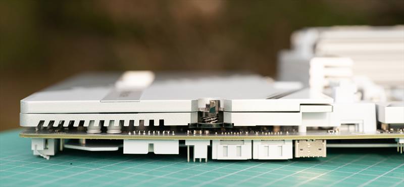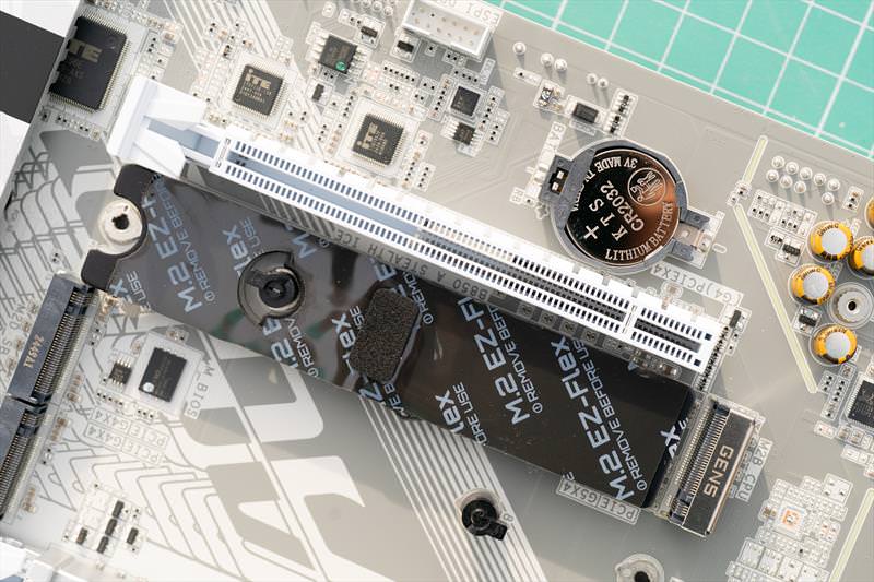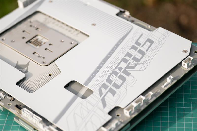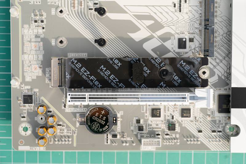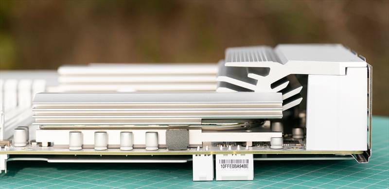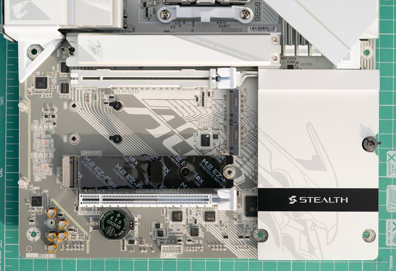 Sub aceste raciri masive se mai afla componente si SSD-urile M.2. Un design curat si cu o singura prindere desfaci toata placa de baza sa faci upgrade la SSD. Problema ramane ca trebuie sa scoti placa video cu totul cand faci asta.