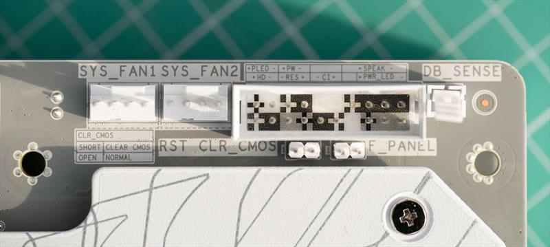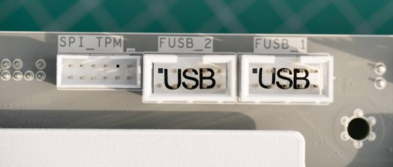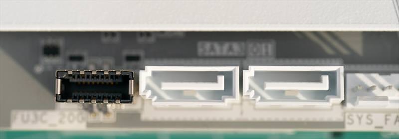 Iata si headerele de USB-C / USB 3.2 + porturile SATA. Aranjarea lor este facuta in ”sir indian” pe spate.