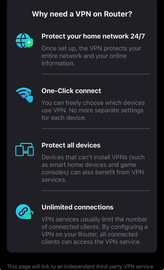 • Exista si suport pentru servere/clienți VPN cu suport pentru NordVPN si mulți alții. Integrarea se face ușor si in acest fel îți mărești securitatea in online pentru tine si familia ta. Ai nevoie doar de un Token de la providerul serviciului VPN si după integrarea poate începe.