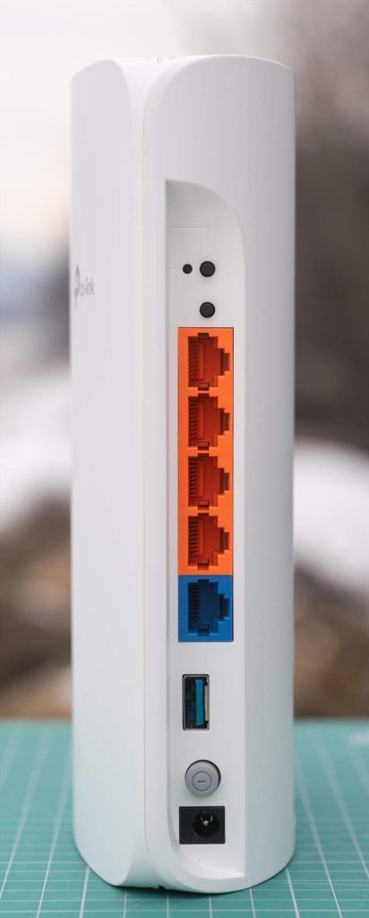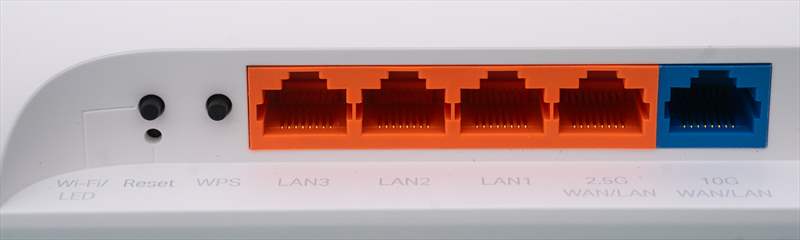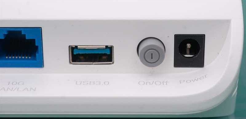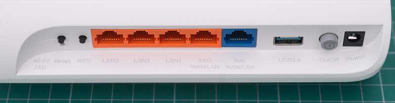 Pe partea din spate a routerului avem conectivitatea formata din 5 porturi RJ45 ( 10 GbE + 2.5 GbE + 3 x 1 GbE ) si port USB 3.0.