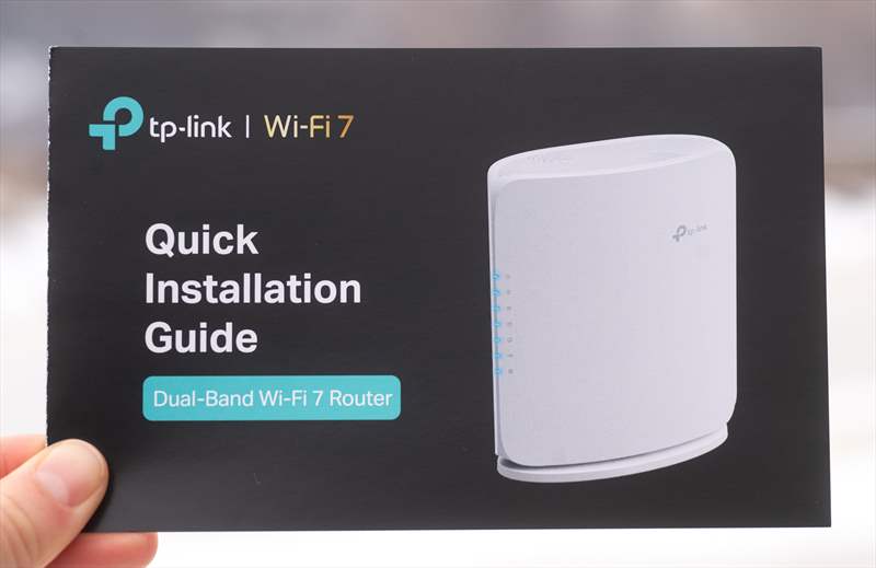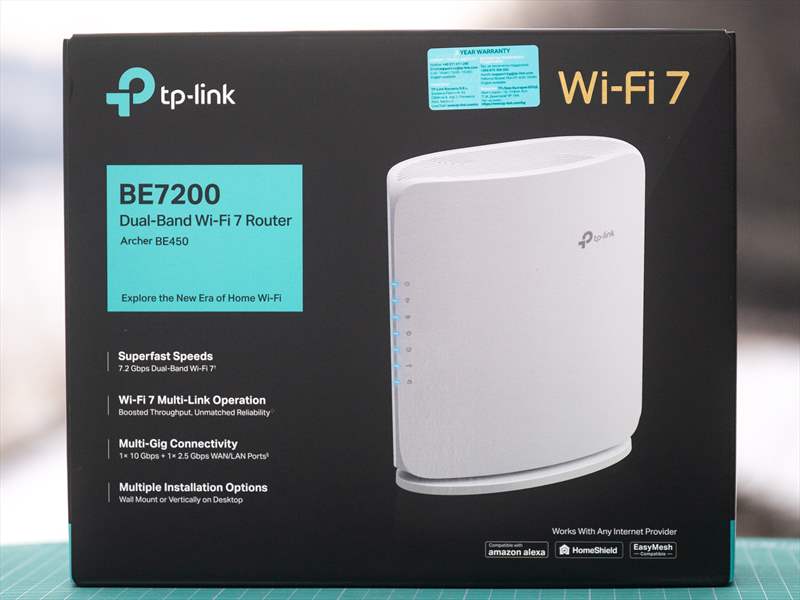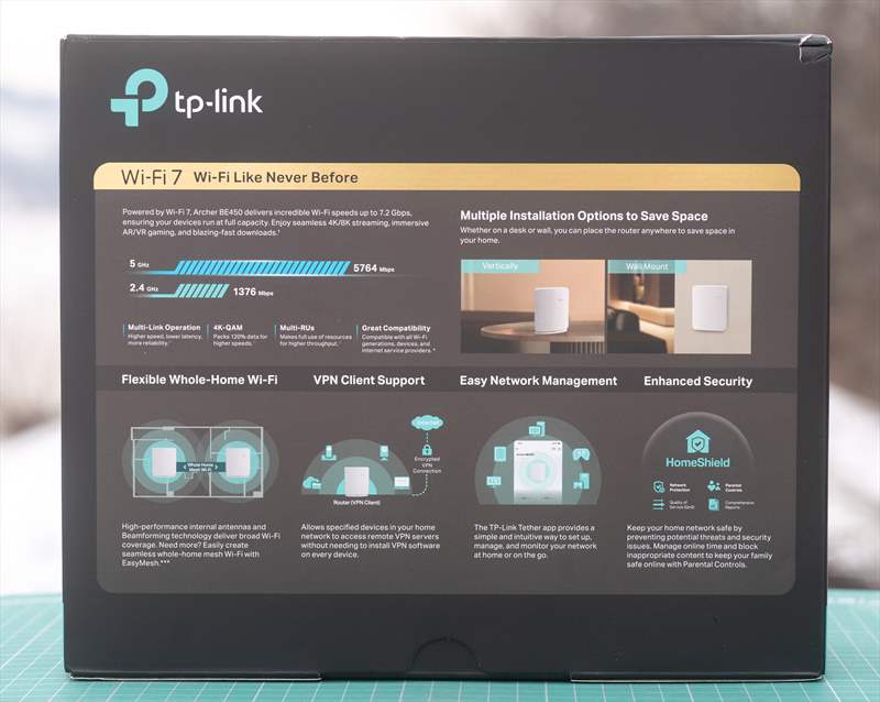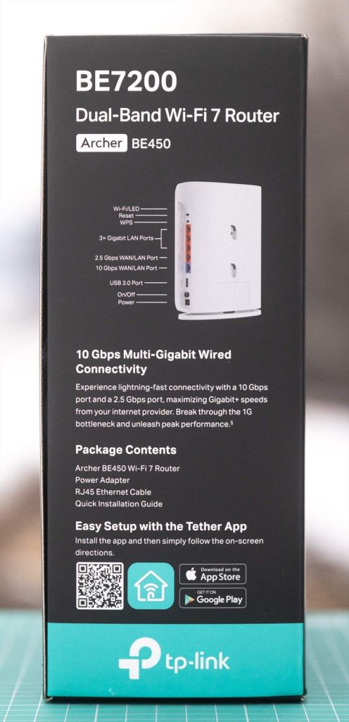 TP-Link Archer BE450 este un router WiFi 7 cu o cutie compacta pe care găsești tot ce înseamnă funcții cheie si specificații cheie pe lateral.