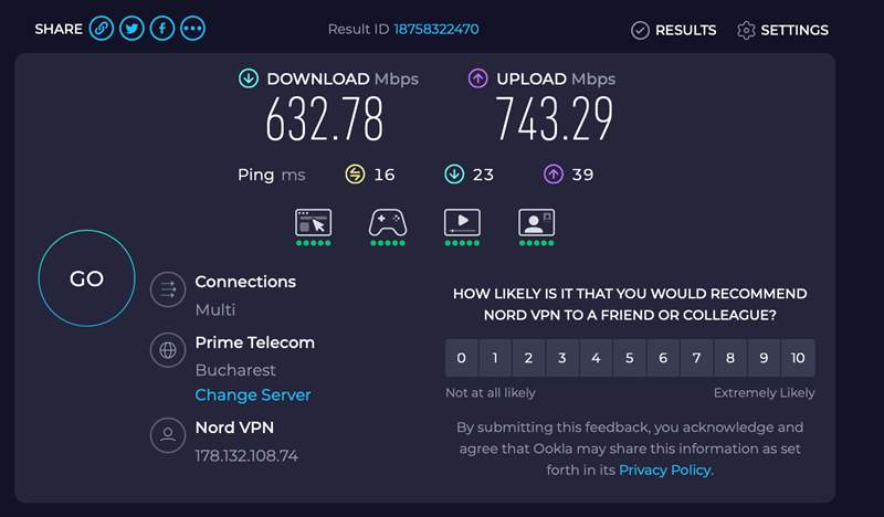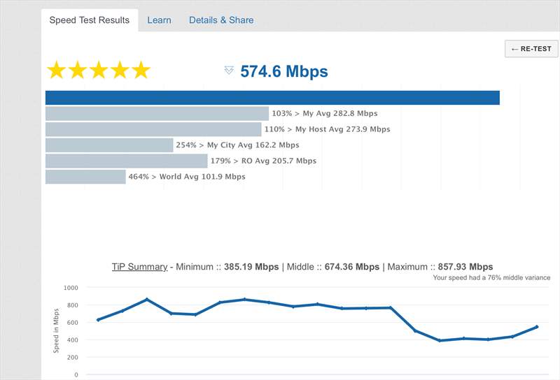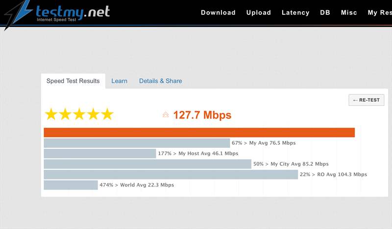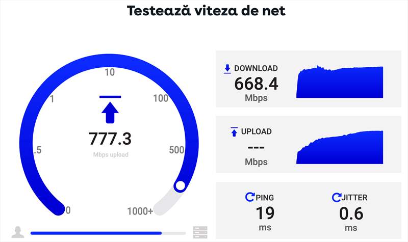 Pe partea de performanța, am configurat Archer BE450 pe un abonament Gigabit de la Digi într-un apartament de 3 camere si 2 bai cu o suprafata totală de 73 m2. Routerul a fost instalat într-o camera la o extrema a apartamentului si pana la baia din colțul opus a mai ajuns ceva semnal ( cam 1/10 din banda totală ). Iată ce cifre am obținut in teste: